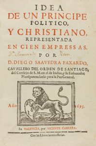 1695. LIBRO : (EMBLEMAS). SAAVEDRA FAXARDO, DIEGO: IDEA DE UN PRINCIPE POLITICO Y CHRISTIANO, REPRESENTADA EN CIEN EMPRESSAS. Valencia : Vicente Cabrera, 1695. 8º mayor. 6 h. + 693 p.