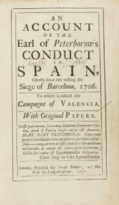 1707. LIBRO : (BARCELONA-GUERRA DE SUCESIÓN). AN ACCOUNT OF THE EARL OF PETERBOROW´S CONDUCT IN SPAIN, CHIEFLY SINCE THE RAISING THE SIEGE OF BARCELONA, 1706.TO WHICH IS ADDED THE CAMPAGNE OF VAELENCIA. Londos : Imp. Jonah Bowyer, 1707. 8º. 4...