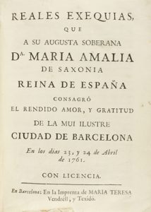 1761. LIBRO : (BARCELONA-EFÍMERA). REALES EXEQUIAS QUE A SU AUGUSTA SOBERANA Dª MARIA AMALIA DE SAXONIA REINA DE ESPAÑA CONSAGRO EL RENDIDO AMOR, Y GRATITUD DE LA MUY ILUSTRE CIUDAD DE BARCELONA EN LOS DIAS 23 Y 24 DE ABRIL DE 1761. Barcelona...