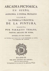 1789. LIBRO : TEBANO, PARRASIO: ARCADIA PICTORICA EN SUEÑO, ALEGORIA O POEMA PROSAICO SOBRE LA RETÓRICA Y PRACTICA DE LA PINTURA. Madrid : Antonio de Sancha, se hallará en su casa de Aduana Vieja, 1789. 8º mayor. 6 h. + 323 p.