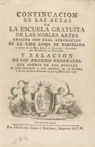 1797. LIBRO : (BARCELONA). CONTINUACION DE LAS ACTAS DE LA ESCUELA GRATUITA DE LAS NOBLES ARTES ERIGIDA CON REAL APROBACION EN LA CASA LONJA DE BARCELONA. Barcelona : Francisco Suria y Burgada, 1797. 4º menor. LXV p.