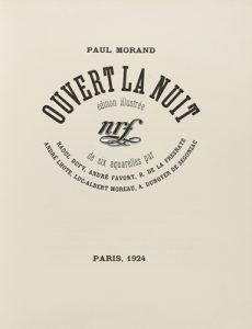 1924. LIBRO : (BIBLIOFILIA). MORAND, PAUL: OUVERT LA NUIT. Paris : Libr. Gallimard, 1924. 4º menor. 184 p., 3 h.