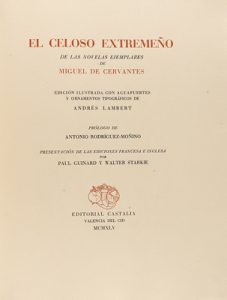 1945. LIBRO : (BIBLIOFILIA). CERVANTES SAAVEDRA, MIGUEL DE [LAMBERT, ANDRES ilustrador]: EL CELOSO EXTREMEÑO. Valencia : Ed. Castalia, 1945. Edición de Antonio Rodríguez-Moñino. 4º mayor. 107 p., 3 h.