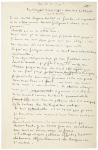 Manuscrit à l’encre de la première partie de ce texte, publié en tiré à part dans La Nouvelle Revue Française d'octobre 1929, et repris en volume, la même année, dans Mes propriétés, puis en 1935 dans La Nuit remue comportant des corrections et de nombreuses variantes.