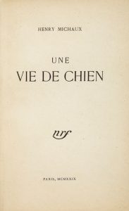 MICHAUX Henri. UNE VIE DE CHIEN. Paris, N. R. F., 1929. Plaquette in-8 brochée, chemise demi-maroquin citron à bandes, dos orné du titre en lettres noires, étui (D.-H. Mercher).