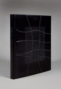 du titre en capitales de box noir, doublures et gardes de veau velours châtaigne, chemise demi-box noir à rabats titrée au palladium, étui (G. Leroux, 1985).