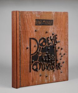 MICHAUX Henri. POÉSIE POUR POUVOIR. Paris, René Drouin, 1949. In-folio, en feuilles, couverture illustrée, chemise-couverture en bois de tek, premier plat titré, illustré et recouvert de clous à galoches, sous chemise titrée, et étui.