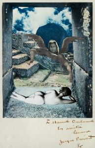 Collage original avec rehauts de gouache blanche, contrecollé sur fond de papier rouge signé au recto par Jacques Prévert. Sur le fond d’une photographie de Nora Dumas figurant le château de Lacoste, Prévert a représenté trois personnages inquiétants, évoquant le marquis de Sade.