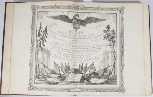 Toutes les planches et cartes sont sur double page, montées sur onglets, et coloriées à l’époque.