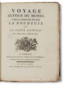 Édition originale, illustrée de 20 cartes dépliantes (îles Malouines, détroit de Magellan, terres de la Nouvelle-Guinée, etc.), dont une grande montrant le trajet de l’expédition, et 3 planches gravées sur cuivre par Croisey représentant des embarcations d’indigènes du Pacifique.