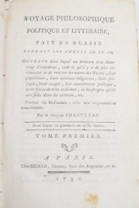 Édition originale, ornée d’une carte dépliante de la Russie et de 3 figures gravées en taille-douce dont deux scènes de moeurs.