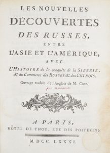 Première édition de la traduction française, traduite de l’anglais, de cet ouvrage sur l’historique des voyages de découvertes entrepris par les Russes dans le nord du Pacifique depuis 1745.
