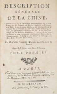 GROSIER (l’Abbé Jean-Baptiste). Description générale de la Chine. Paris, Moutard, 1787. 2 volumes in-8, demi-chagrin aubergine, dos lisse orné (Reliure du XIXe siècle).