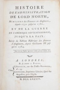 HILLIARD D’AUBERTEUIL (Michel-René)] Histoire de l’administration de lord North, ministre des Finances en Angleterre, depuis 1770 jusqu’en 1782, et de la guerre de l’Amérique septentrionale, jusqu’à la paix. Londres, Et se trouve à...