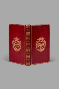 rouge, triple filet doré, armoiries au centre, dos lisse orné, roulette