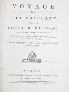 LE VAILLANT (François). Voyage dans l’intérieur de l’Afrique par le Cap de Bonne-Espérance. Paris, Déterville, De l’Imprimerie de H. L. Perronneau, s.d. [1795]. Un volume. — Second voyage dans l’intérieur de l’Afrique, par le Cap...