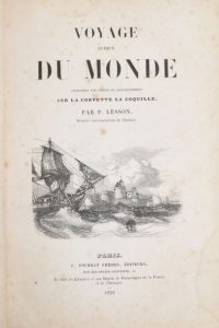 LESSON (René-Primevère). Voyage autour du monde entrepris par ordre du gouvernement sur la corvette La Coquille. Paris, Pourrat frères, 1838-1839. 2 volumes in-8, demi-basane bleu nuit, dos lisse orné, tranches marbrées (Reliure de...