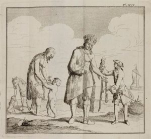 La planche n°XVI illustre une rencontre pacifique entre un Européen et une famille de Patagons.