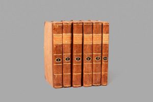 VANCOUVER (George). Voyage de découvertes, à l’océan Pacifique du Nord, et autour du monde. Paris, De l’Imprimerie de Didot jeune, An X [1801-1802]. 6 volumes in-8, demi-veau fauve avec petits coins, dos lisse orné, pièces de titre beige...