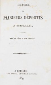 BARBÉ-MARBOIS (François de). Histoire de plusieurs déportés à Sinnamari, racontée par un père à ses fils. Limoges, Barbou, 1839. In-12, basane fauve, filet doré, plaque rocaille frappée à froid sur les plats, dos lisse orné, tranches...