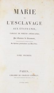 BEAUMONT (Gustave de La Bonninière de). Marie ou l’Esclavage aux États-Unis, tableau de moeurs américaines. Paris, Librairie de Charles Gosselin, 1835. 2 tomes en un volume in-8, demi-basane bleu foncé, dos orné, nerfs soulignés d’une...