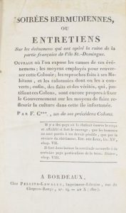 CARTEAU (J.-Félix). Soirées bermudiennes, ou Entretiens sur les événemens qui ont opéré la ruine de la partie française de l’île St-Domingue. Bordeaux, Pellier-Lawalle, An X (1802). — Examen politique des colonies modernes, Dans le but...