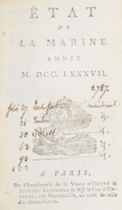 Ouvrage imprimé sur l’ordre du Maréchal de Castries, Ministre et secrétaire d’État au département de la Marine, contenant, outre un calendrier pour 1787, une longue liste des officiers de la Marine et un état des colonies françaises de Saint-Domingue, de la Martinique, Guadeloupe, Sainte-Lucie, Guyane, de Saint-Pierre et Miquelon, du Sénégal, etc.Notes manuscrites de l’époque sur le titre.
