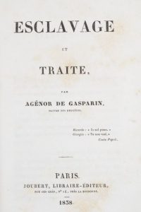 GASPARIN (Agénor de). Esclavage et traite. Paris, Joubert, 1838. — De l’affranchissement des esclaves et de ses rapports avec la politique actuelle ; pour faire suite à Esclavage et traite. Paris, Joubert, 1839. Ensemble 2 ouvrages en un...