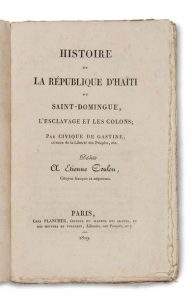 GASTINE (Civique de). Histoire de la république d’Haïti ou Saint-Domingue, l’esclavage et les colons. Paris, Plancher, 1819. In-8, broché, non rogné, couverture de l’époque, pièce de titre imprimée au dos.