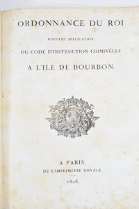 ÎLE DE LA RÉUNION. — Ordonnance du Roi portant application du code d’instruction criminelle à l’île de Bourbon. Paris, De l’Imprimerie royale, 1828. In-4, veau porphyre, roulette dorée, dos lisse orné, pièce de titre rouge, roulette...