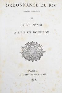 ÎLE DE LA RÉUNION. — Ordonnance du Roi portant application du code pénal à l’île de Bourbon. Paris, De l’Imprimerie royale, 1828. In-4, veau fauve, roulette dorée, dos lisse orné, roulette intérieure, tranches dorées (Reliure de...