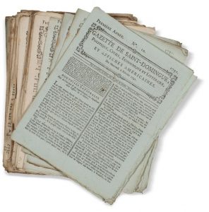 TRÈS RARE JOURNAL RÉVOLUTIONNAIRE IMPRIMÉ AU PORT-AU-PRINCE À SAINT-DOMINGUE, dont il a paru au moins 93 numéros, du 1er janvier au 19 novembre 1791 (cf. Menier et Debien, « Journaux de Saint-Domingue » in Revue d’histoire des colonies, t. 36, 1949, pp. 437-441).