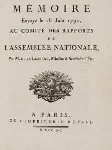 LA LUZERNE (Comte de). Mémoire envoyé le 18 juin 1790, au Comité des rapports de l’Assemblée nationale. Paris, De l’Imprimerie royale, 1790. 3 parties en un volume in-4, veau marbré, dos lisse orné, pièce de titre rouge, petites...