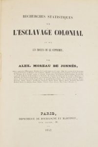 MOREAU DE JONNÈS (Alexandre). Recherches statistiques sur l’esclavage colonial et sur les moyens de le supprimer. Paris, Imprimerie de Bourgogne et Martinet, 1842. In-8, broché.