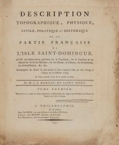 MOREAU DE SAINT-MÉRY (Médéric-Louis-Élie). Description topographique, physique, civile, politique et historique de la partie française de l’isle Saint-Domingue. Philadelphie, Chez l’Auteur ; Paris, Dupont ; Hambourg, Chez les principaux...