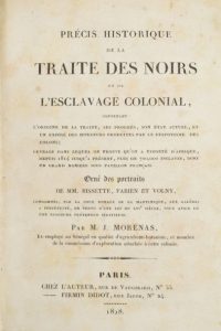 MORENAS (Joseph). Précis historique de la traite des Noirs et de l’esclavage colonial. Paris, Chez l’Auteur, Firmin Didot, 1828. In-8, demi-basane verte, dos lisse orné, tranches marbrées (Reliure de l’époque).