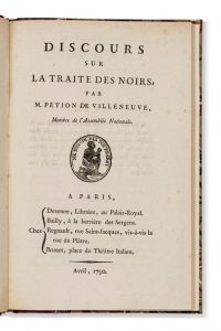 PÉTION DE VILLENEUVE. Discours sur la traite des Noirs. Paris, Desenne, Bailly, Regnault, Brunet, avril 1790. In-8, bradel demi-maroquin rouge, dos lisse portant le titre doré en long (Reliure moderne).