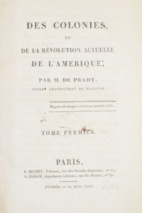 L’abbé de Pradt (1754-1837) traite des pratiques révolutionnaires dans les colonies françaises, espagnoles et portugaises d’Amérique et donne des détails sur l’économie des colonies, l’esclavage à Saint-Domingue, etc.