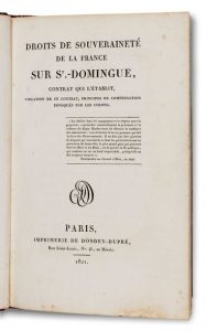 SAINT-DOMINGUE. — Droits de souveraineté de la France sur St-Domingue, contrat qui l’établit, violation de ce contrat, principes de compensation invoqués par les colons. Paris, Imprimerie de Dondey-Dupré, 1821. Plaquette in-8, cartonnage...
