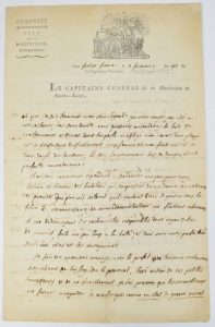 [...] je l’ai prévenu que les circonstances me forçant à regarder la Martinique comme en état de guerre moral et la police ordinaire n’ayant ni assez d’étendue ni assez d’activité en pareil cas, j’évoquais à moy la haute police dont dépend la sureté de la colonie qui m’est confié [...] j’ai en conséquence crée [sic] une gendarmerie, une commission militaire et rendu des loix sur le vagabondage qui me préservent, j’espère de l’influence des événemens de la Guadeloupe et de St Domingue [...].