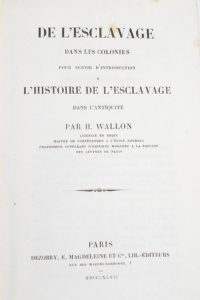 WALLON (Henri). De l’esclavage dans les colonies pour servir d’introduction à l’Histoire de l’esclavage dans l’Antiquité. Paris, Dezobry, E. Magdeleine et Cie, 1847. 3 volumes in-8, demi-chagrin brun, dos orné, tranches mouchetées...