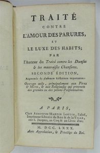 GAUTHIER (Abbé Françoi-Louis). Traité contre l amour des parures et le luxe des habits par l auteur du traité contre les danses & le mauvaises chansons. Seconde édition augmentée de plusieurs réflexions importantes. Paris, Lottin, 1780....