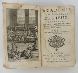 [JEUX]. Académie universelle des jeux contenant les règles des jeux de cartes permis, du Tric-Trac, des échacs, de la Paulme, du Mail, du billard & autres avec instructions faciles pour apprendre à les bien jouer. Paris, Le Gras, 1718. In-12,...