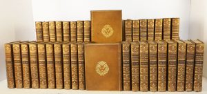 Traces de mouillures anciennes sur les plats et dos des T. 3,4,5,8,23,35 et petit manque de cuir au coin inférieur du T. 36.