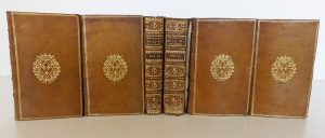 volumes, in-12, maroquin citron, dos à nerfs ornés de fleurons dorés, triples encadrements dorés sur les plats ornés en leurs centres des armes dorées de Madame Sophie,6ième fille de Louix XV.