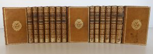 16 volumes, in-12, maroquin citron, dos à nerfs ornés de fleurons dorés, triples encadrements de filets dorés sur les plats avec en leurs centres les armes dorées de Madame Sophie, 6ième fille de Louis XV, dentelles intérieures et tranches dorées.