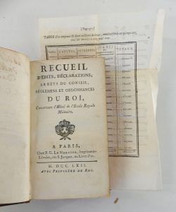 [ÉCOLE MILITAIRE]. Recueil d'édits, déclarations, arrêts du Conseil, règlemens et ordonnances du Roi, concernant l'Hôtel de l'École Royale Militaire. Paris, Le Mercier, 1762. In-12 veau marbré ép., dos à nerfs orné, p. de titre en mar....