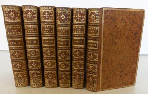 6 volumes in-12, veau blond tacheté, dos à nerfs ornés de fleurons dorés, triples filets dorés encadrant les plats.Tranches dorées et dentelles intérieures.