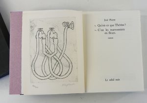 CURIOSA-SURRÉALISME et KLAPHECK (Konrad) & PIERRE (José).. -Qu'est-ce que Thérèse ? - C'est les marronniers en fleurs. Sl, Le Soleil noir, 1974. In-8 broché, couv. noire muette sous jaquette imprimée et étui.
