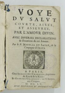 DU SAULX (Nicolas). Voye du Salut courte, aisée et asseurée, par l'amour divin. Avec diverses déclarations & élevations de cet Amour. Paris, Cramoisy, 1655. In-8 vélin ép. de (12), 430, (2) pp.